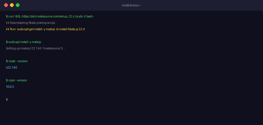 Debian's default apt repositories ship an outdated Node.js version. Use NodeSource to get Node 22: