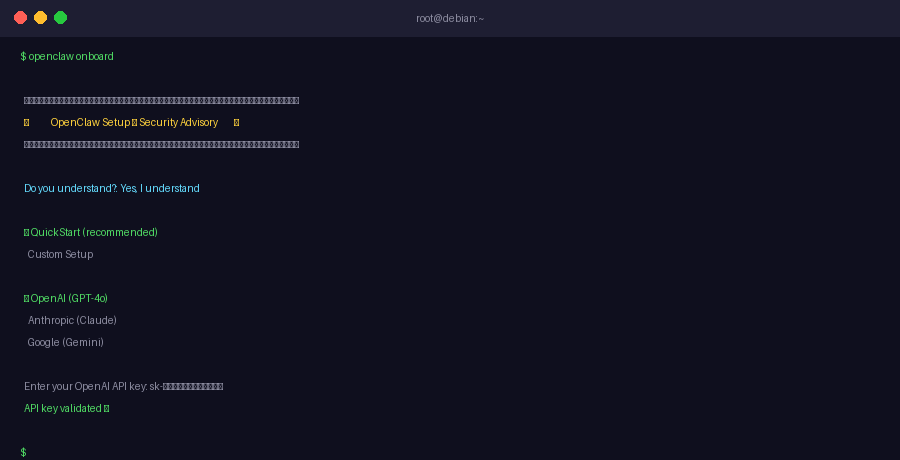 openclaw onboard- Accept the security advisory — select "Yes, I understand"