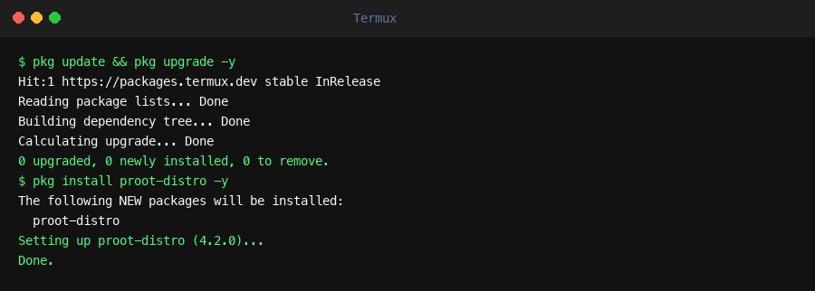 Termux — updating packages and installing proot-distro