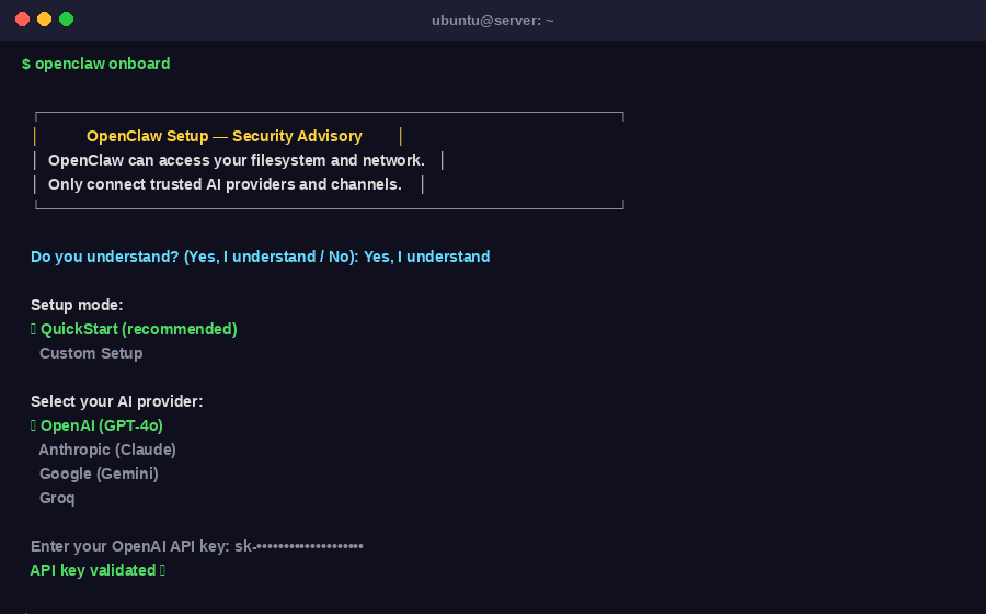 openclaw onboardThe wizard will ask you to: